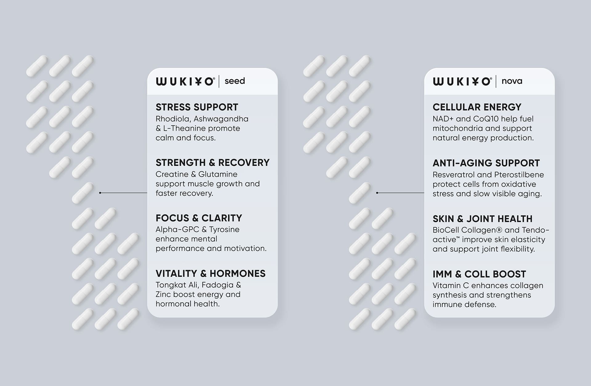 WUKIYO | seed and WUKIYO | nova support adrenal resilience, hormonal balance, and cellular energy repair.