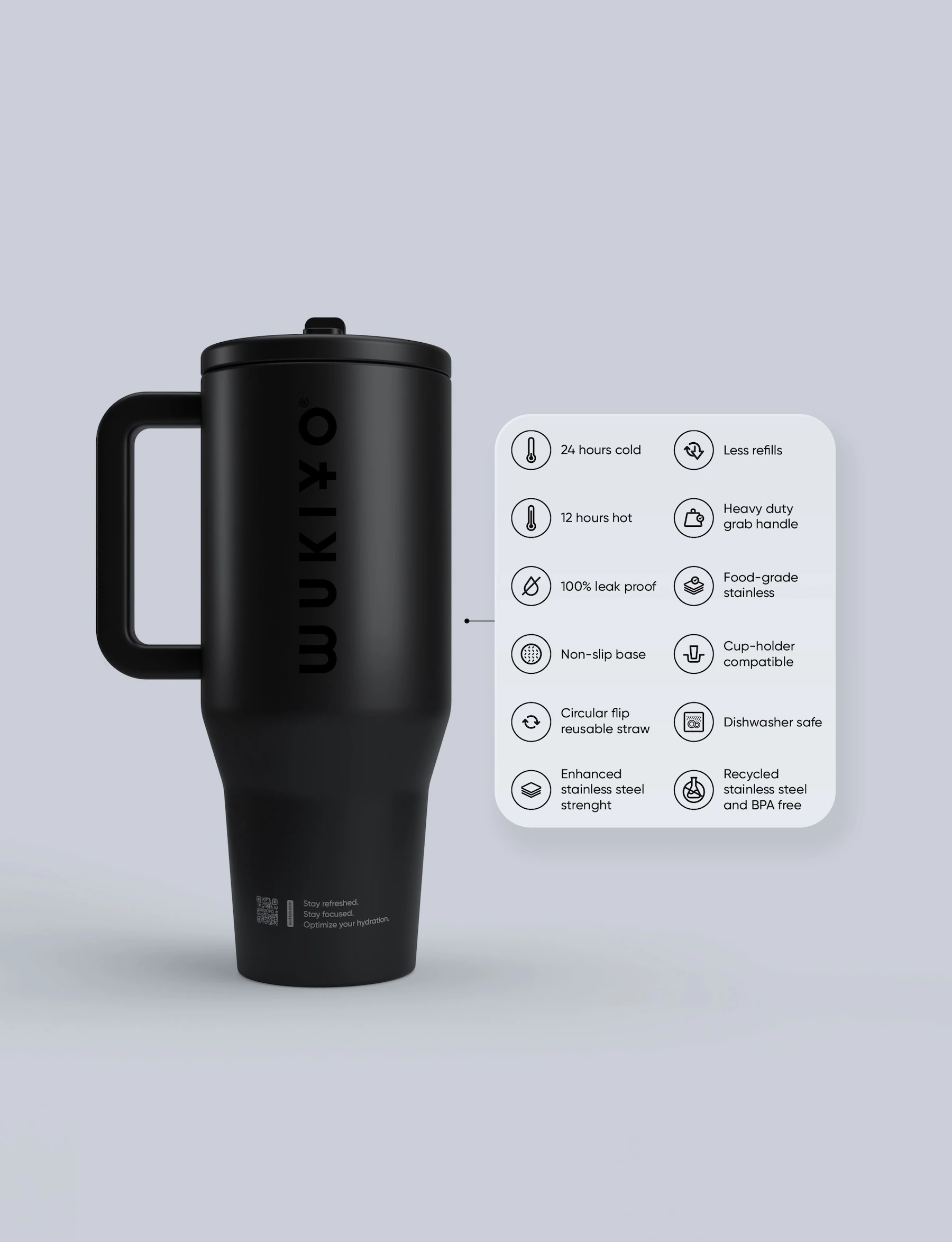 Constructed from premium recycled stainless steel, the WUKIYO® 40 oz. cup is meticulously crafted for the modern achiever seeking optimal hydration with unparalleled style and functionality.